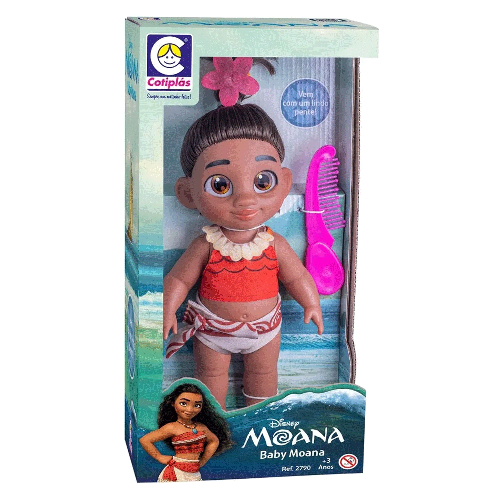 Visual Fiel: A Baby Moana veste sua roupinha tradicional e tem o cabelo preso com uma flor (impresso na caixa), com detalhes que remetem fielmente à personagem.